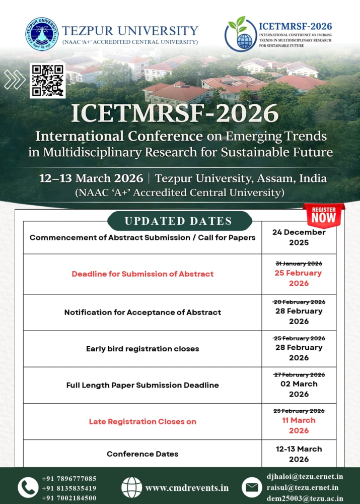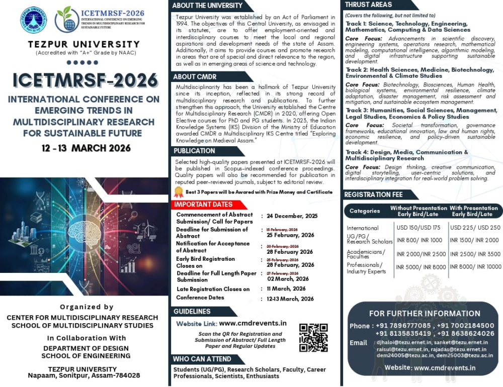 The International Conference on Emerging Trends in Multidisciplinary Research for Sustainable Future (ICETMRSF-2026), organised by the Centre for Multidisciplinary Research in collaboration with the university’s Department of Design, will take place on 12–13 March 2026.