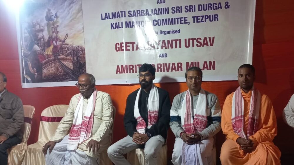 The cultural programme continued with a melodious rendition of ‘Borgeet’, accompanied by Khol and Taal, presented by Shri Suren Baruah and his two associates. The evening featured insightful speeches from prominent figures, including Dr. Neelkamal Pandit, Associate Professor of Sanskrit at Darrang College, Tezpur; two ISKCON Sannyasis from the ISKCON Matha in Dhekiajuli; and Gangaram Boro from Vivekananda Kendra Kanyakumari Tezpur Branch.