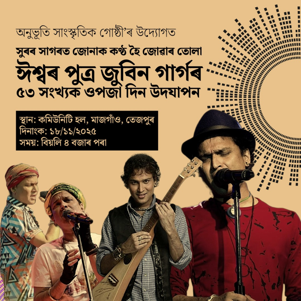 The 53rd birthday of legendary artist Zubeen Garg was celebrated with vibrant colours, elegance, and heartfelt admiration at the Mazgaon Community Hall in Tezpur on Tuesday, 18 November 2025. Organised by the Anubhuti Cultural Group, the event brought together artists, educationists, cultural figures, and enthusiastic residents to honour the iconic singer’s life and legacy.